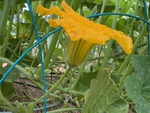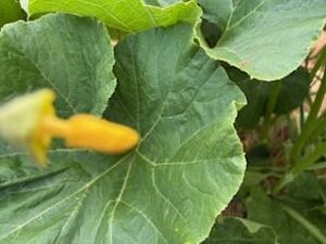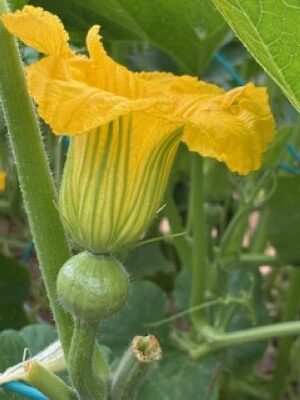早朝に畑を覗くと、黄色い花の下が膨らんだ雌花咲いてました。